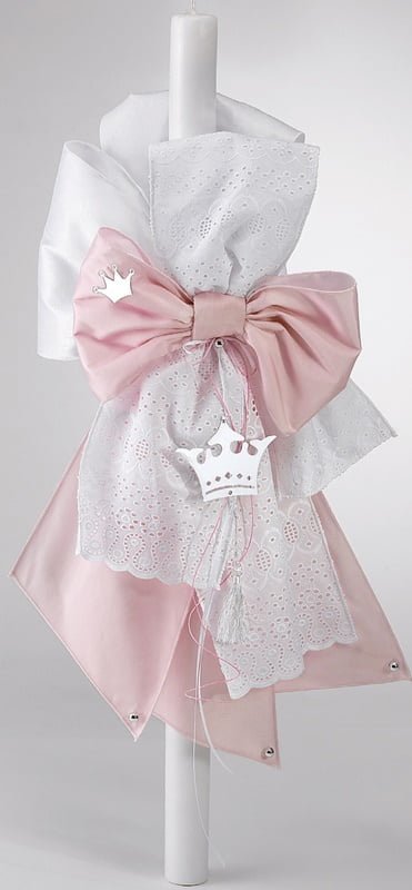 Λαμπάδα βάπτισης με κορώνες και φιόγκο σε ροζ/λευκό χρώμα. Παράδοση σε 15-20 εργάσιμες μέρες. BULA ΛΑΜ159