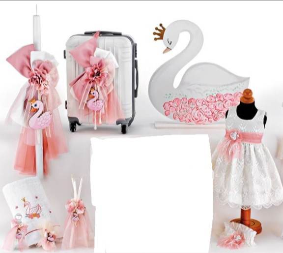 Σετ βάπτισης για κορίτσι με θέμα κύκνος. Το σετ περιλαμβάνει βαλίτσα στολισμένη, λαμπάδα, λαδόπανα και λαδοσέτ.Παράδοση σε 15-25 εργάσιμες μέρες.K2362