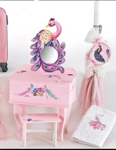 Σετ βάπτισης για κορίτσι με θέμα παγώνι σε ροζ-μωβ χρωματισμούς. Το σετ περιλαμβάνει μπουντουάρ, λαμπάδα, λαδόπανα και λαδοσετ. Παράδοση σε 15-25 εργάσιμες μέρες.Κ2335.