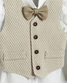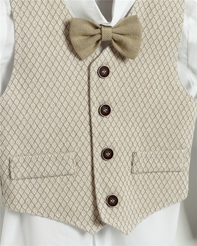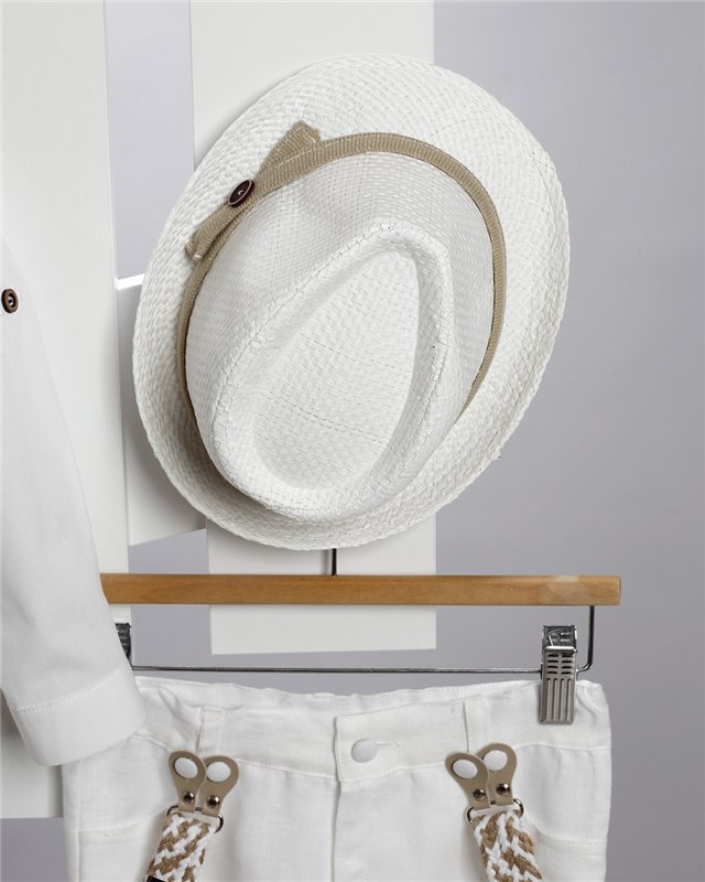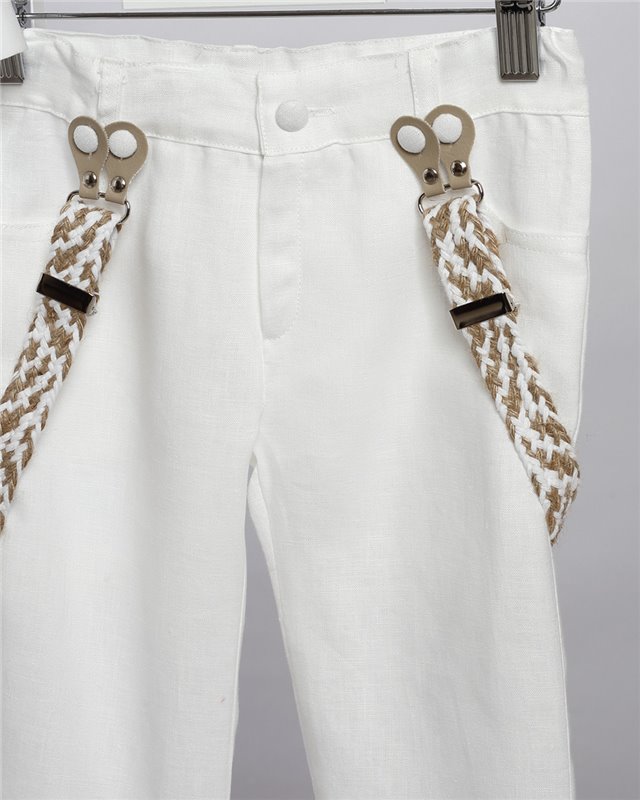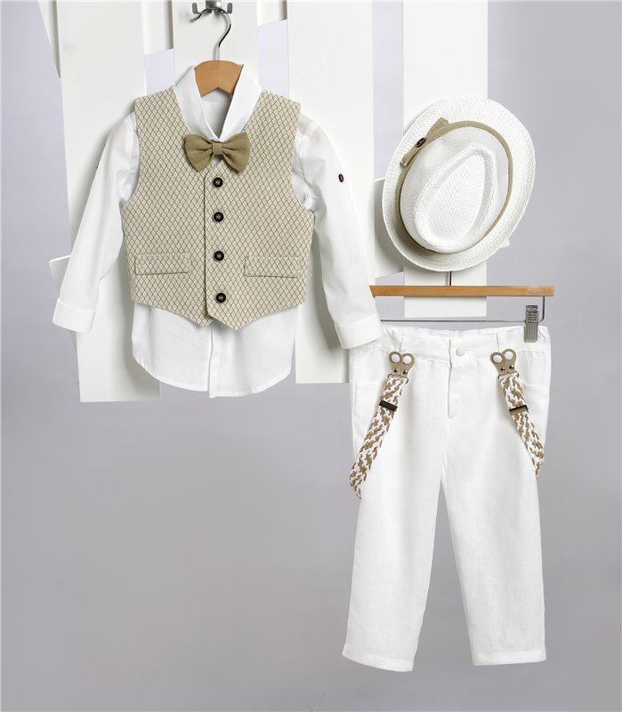 Άσπρο λινό παντελόνι με ράντες και μπεζ καμπαρντίνα γιλέκο. Άσπρο βαμβακερό πουκάμισο και ψάθινο γιλέκο. Εταιρεία New Life 2715-1. Παράδοση σε 10-15 εργάσιμες μέρες.