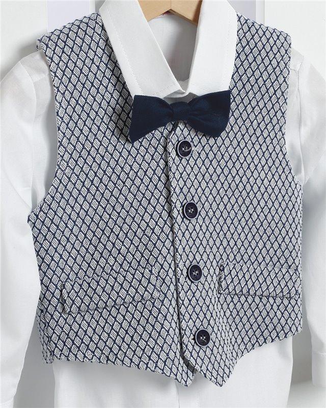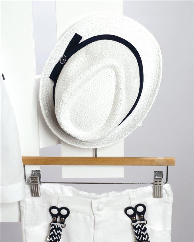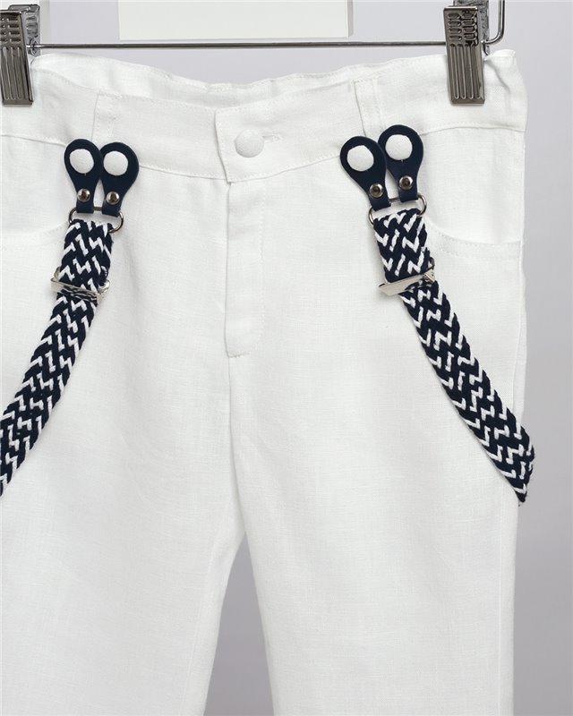 Άσπρο λινό παντελόνι με ράντες και μπλε καμπαρντίνα γιλέκο. Άσπρο βαμβακερό πουκάμισο και ψάθινο καπέλο. Εταιρεία New Life 2715-2. Παράδοση σε 10-15 εργάσιμες μέρες.