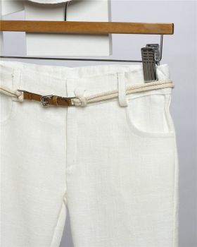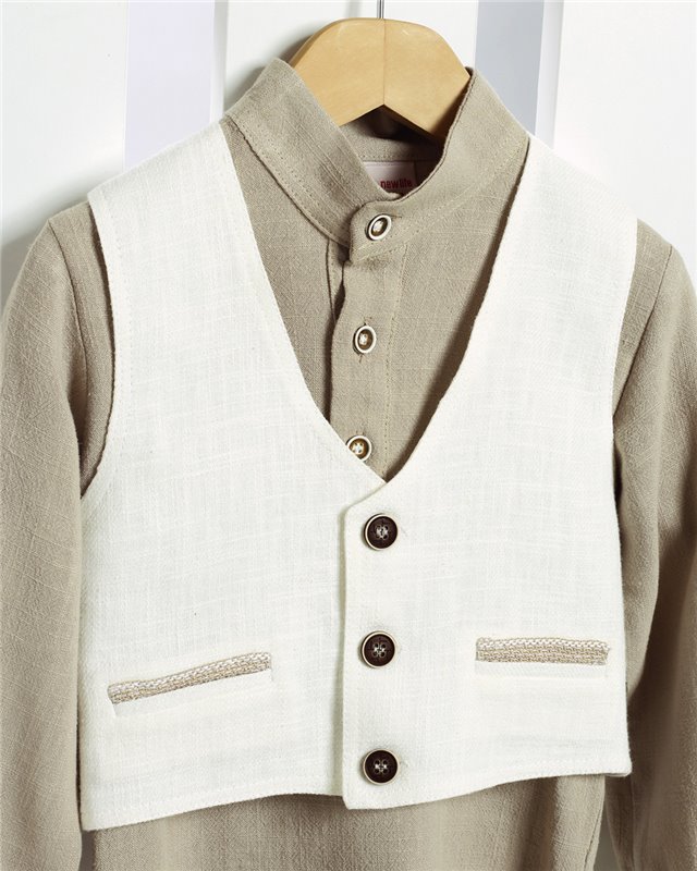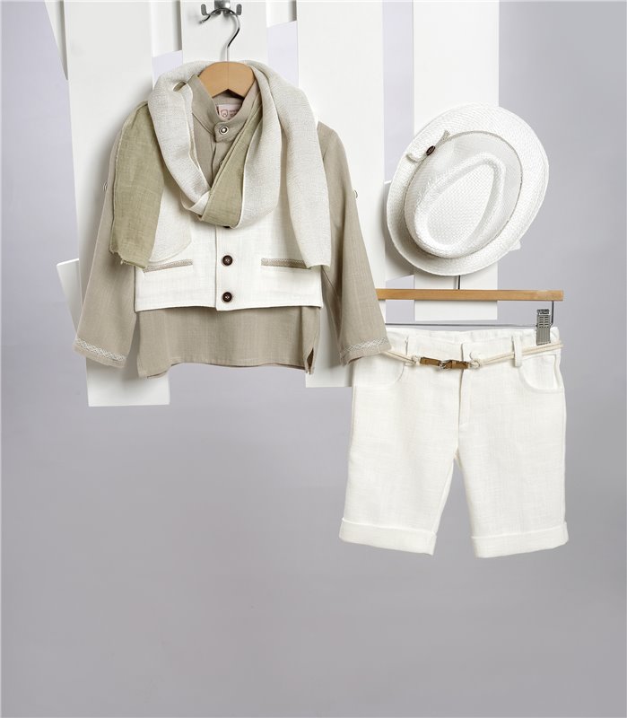 Εκρού λινή βερμούδα και γιλέκο. Μπεζ βαμβακερή πουκαμίσα και φουλάρι απο γάζα. Ψάθινο λευκό καπέλο. Εταιρεία New Life 2707-1. Παράδοση σε 10-15 εργάσιμες μέρες.