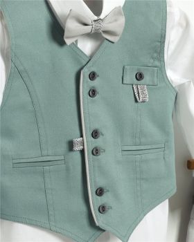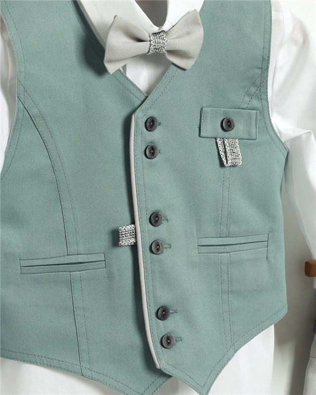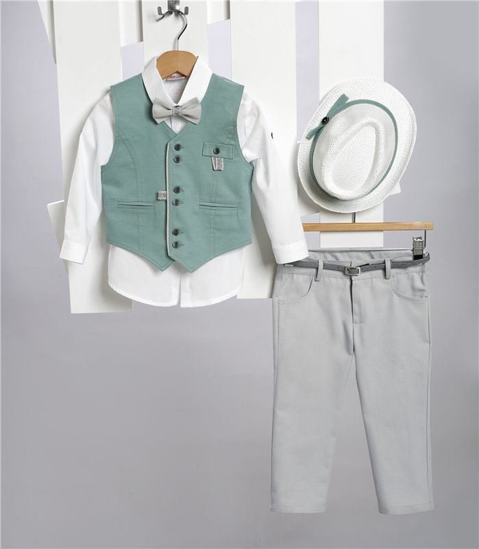 Γκρι καμπαρντίνα παντελόνι και βεραμάν καμπαρντίνα γιλέκο. Άσπρο βαμβακερό πουκάμισο και άσπρο ψάθινο καπέλο. Εταιρεία New Life 2725-2. Παράδοση σε 10-15 εργάσιμες μέρες.