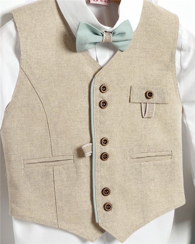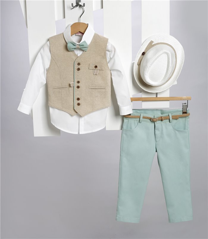 Βεραμάν καμπαρντίνα παντελόνι και μπεζ καμπαρντίνα γιλέκο. Άσπρο βαμβακερό πουκάμισο και άσπρο ψάθινο καπέλο. Εταιρεία New Life 2725-1. Παράδοση σε 10-15 εργάσιμες μέρες.