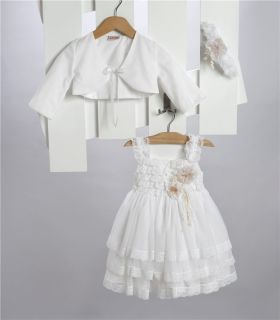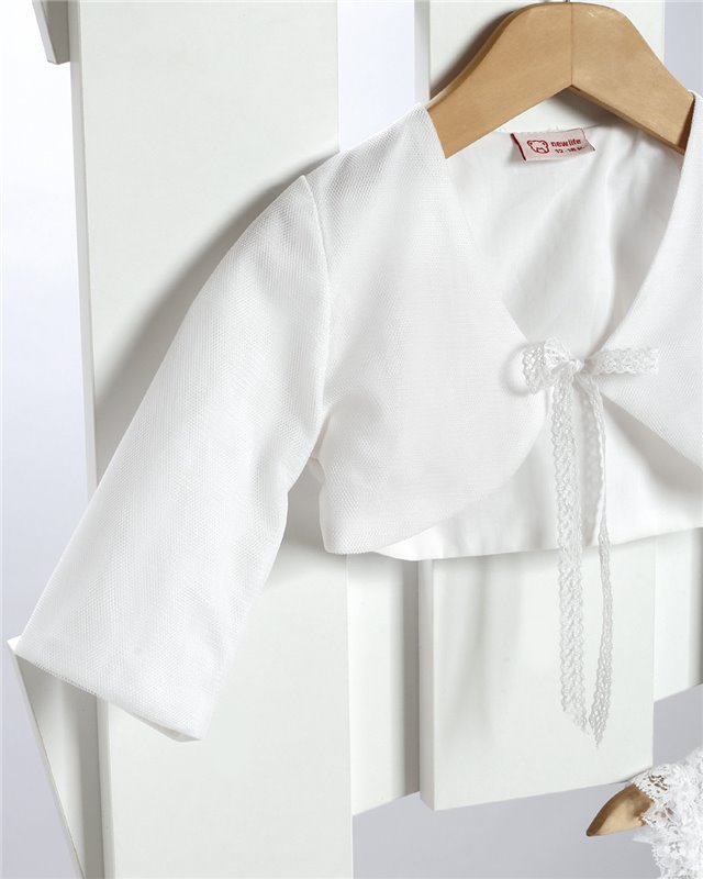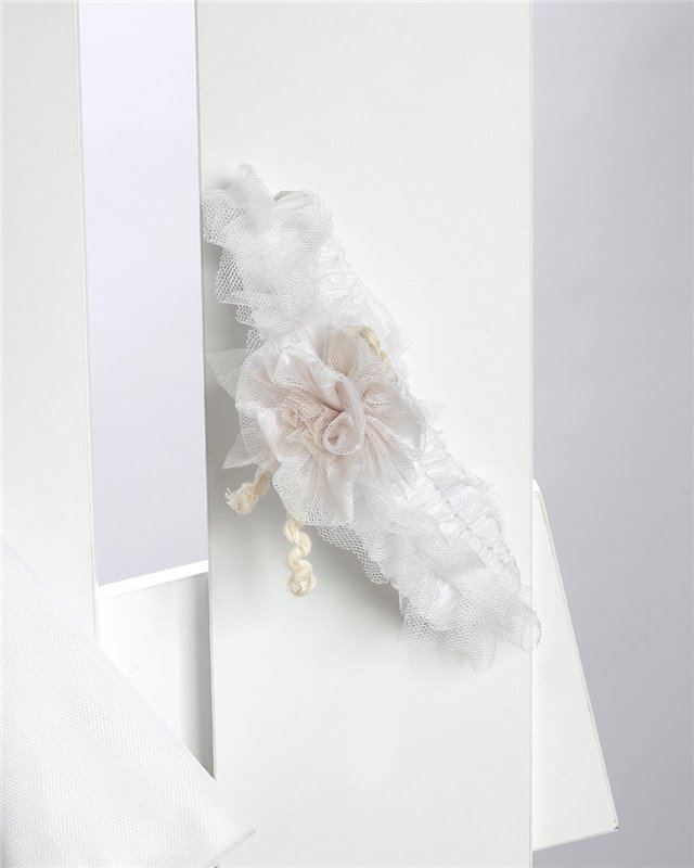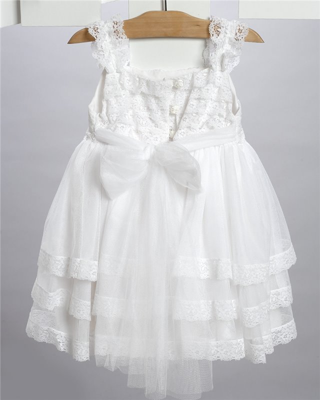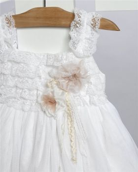 Άσπρο φόρεμα απο τούλι και δαντέλα στολισμένο με τούλινα λουλούδια και κορδελάκιΑ.