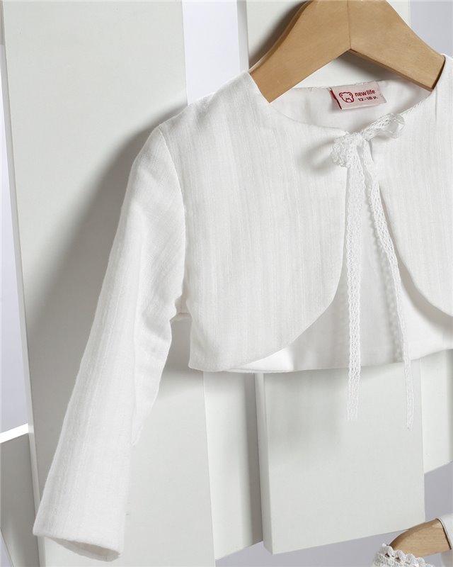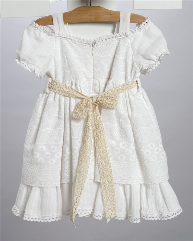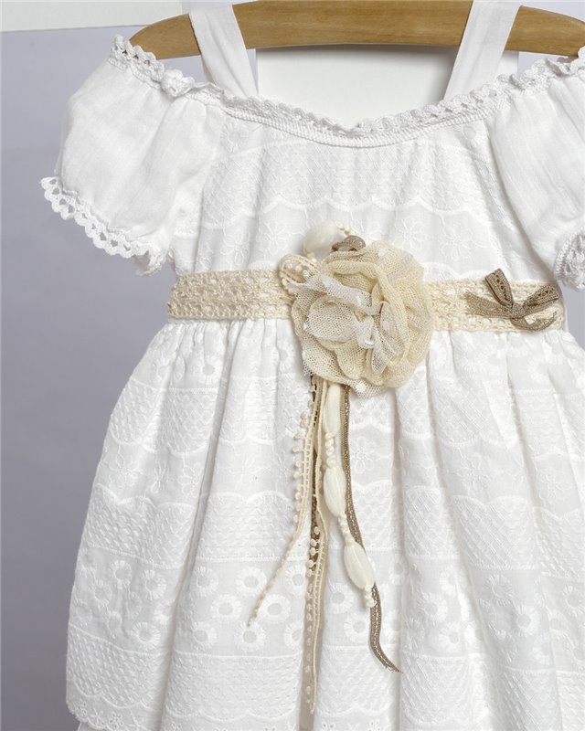Άσπρο φόρεμα απο βαμβακερό μπροντερί στολισμένο με πλεκτή ζώνη και τούλινο λουλούδι. Εταιρεία New Life 2714-1. Παράδοση σε 10-15 εργάσιμες μέρες.